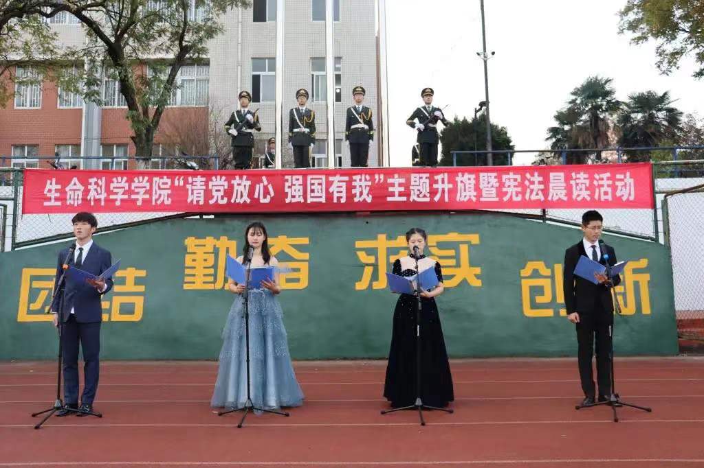 “本宪法以法律的形式确认了中国各族人民奋斗的成果,规定了国家的根本制度和根本任务,是国家的根本法,具有最高的法律效力……”11月29日早上,“请党放心,强国有我”主题升旗仪式暨宪法晨读活动在校运动场举行,学校师生代表1800余人参与了晨读活动,诵读了宪法部分章节。大家精神饱满,情绪激昂,通过大声朗读用心体会宪法的庄严与神圣。