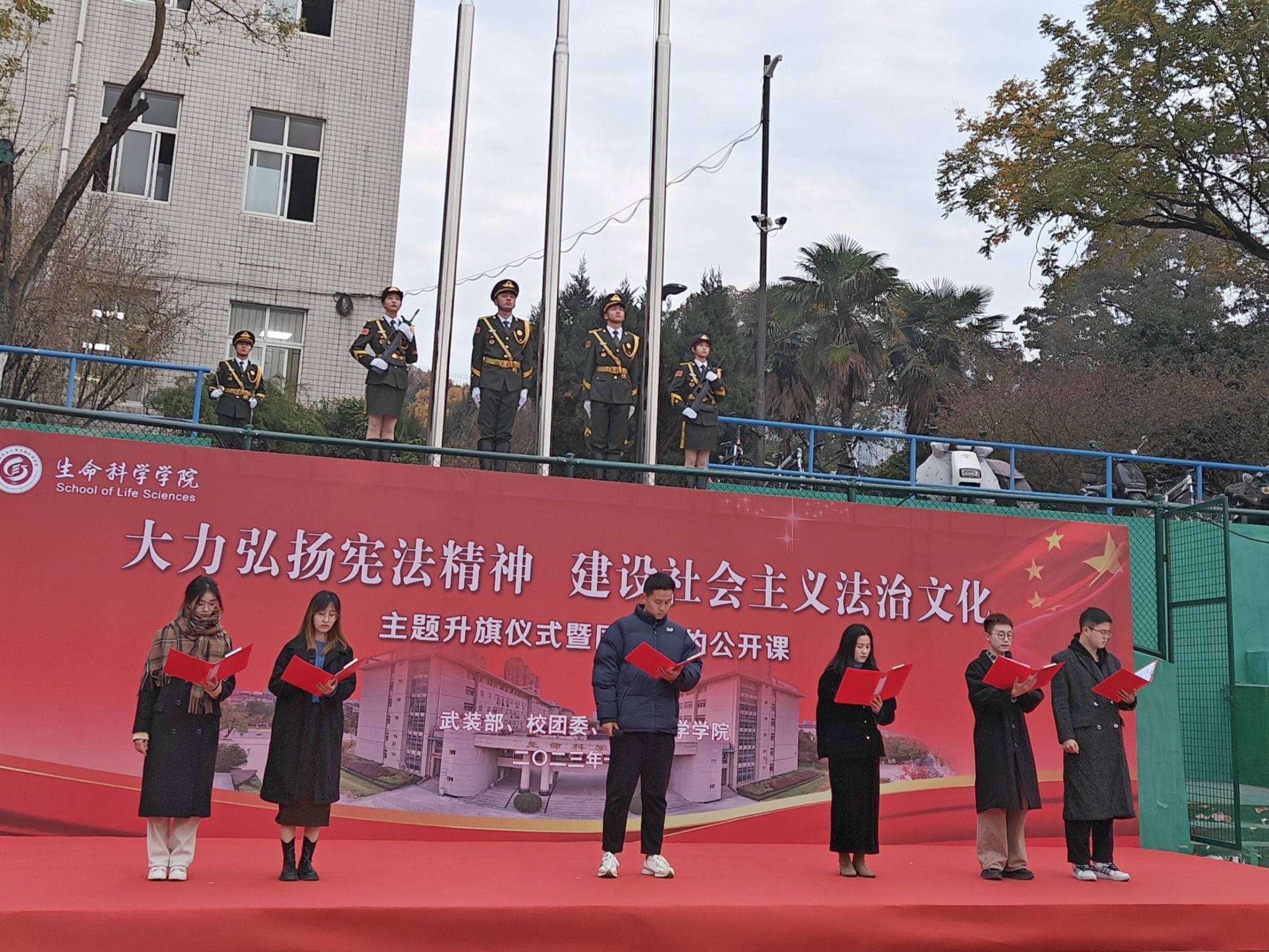 12月4日上午,2000多名师生代表齐聚田径运动场,举行主题升旗仪式。在鲜艳的五星红旗下,广大师生进行集体宪法晨读,声声入耳,字字入心,在诵读中感受宪法的神圣和庄严。各学院共组织1000余名青年学生集中观看教育部全国青少年普法网直播活动,齐声诵读宪法部分条款。学校还特别邀请服务基层的校友郭钊阳录制了“宪法晨读”音频,以榜样力量引领青年学子知法于心。